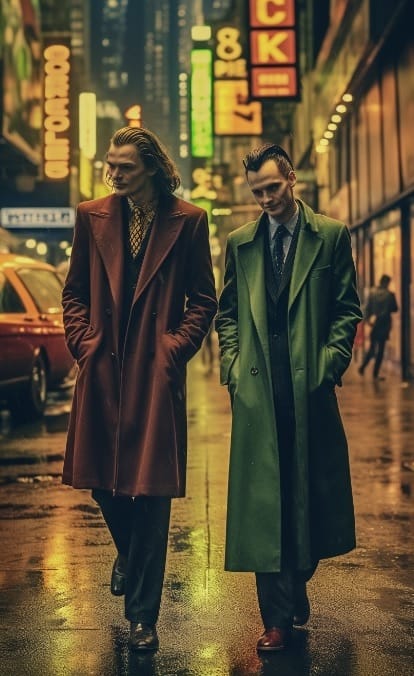 Strutting down the neon-glow streets, these two AI-generated gents are serving serious retro detective vibes.